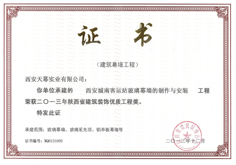 2013年度陜西省建筑裝飾優(yōu)質(zhì)工程——西安城南客運(yùn)站