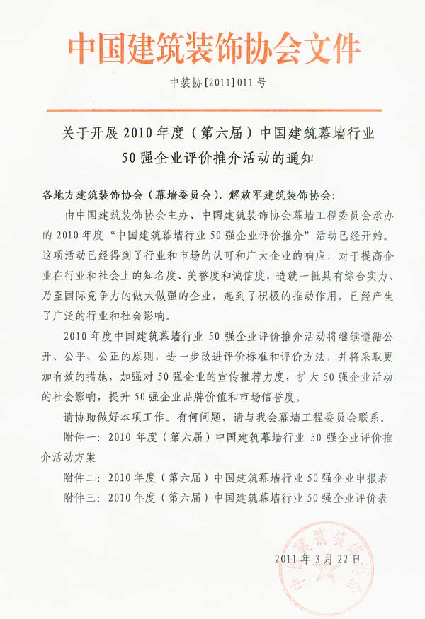 2010年度(第六屆)中國建筑幕墻行業(yè)50強企業(yè)評價推介活動的通知
