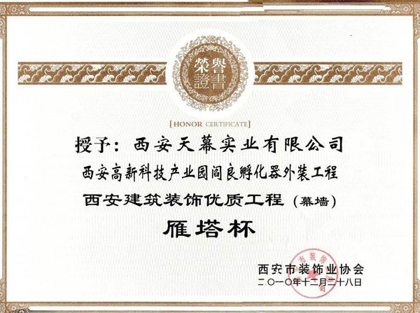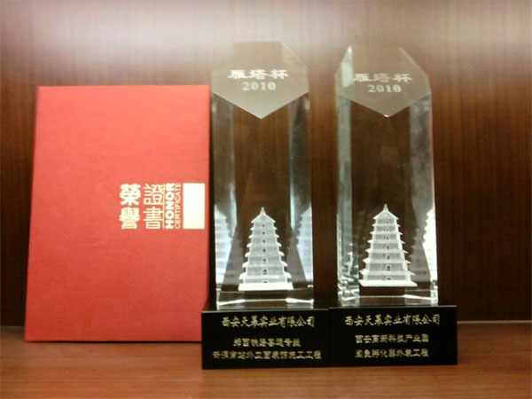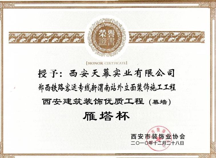 會上,副會長黃柱子通報獲得“西安建筑裝飾優(yōu)質(zhì)工程(雁塔杯)”企業(yè)并授牌;其中由我公司承建的的“鄭西鐵路客運專線新渭南站外立面裝飾施工工程”和“西安高新科技產(chǎn)業(yè)園閻良孵化器外裝工程”同時獲得“西安建筑裝飾優(yōu)質(zhì)工程(雁塔杯)”獎。此次獲獎是對公司在過去一年中所做成績的肯定,公司全體管理人員秉承企業(yè)精神,項目部精心組織,精心施工,取得了經(jīng)濟效益的同時也為公司爭得了榮譽。也是對“出自天幕,必為精品”的經(jīng)營理念的最好詮釋。