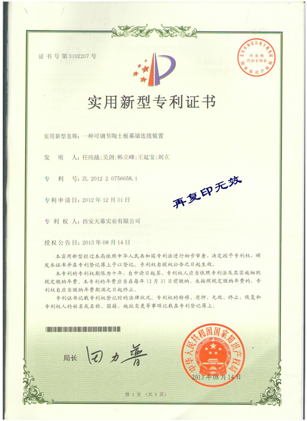 我公司再獲國(guó)家知識(shí)產(chǎn)權(quán)局頒發(fā)的"一種可調(diào)節(jié)陶土板幕墻連接裝置"實(shí)用新型專利,于近日獲得產(chǎn)權(quán)證書。