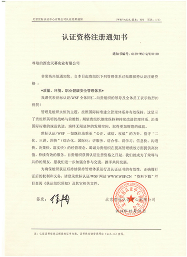而就在這天,我公司收到北京世標(biāo)認(rèn)證中心寄來(lái)的快件,宛如陽(yáng)光,溫暖著天幕人。而快件的內(nèi)容更像是古時(shí)候軍隊(duì)傳來(lái)的捷報(bào),振奮人心——我公司成功取得“質(zhì)量、環(huán)境、職業(yè)健康安全管理體系”認(rèn)證注冊(cè)資格。