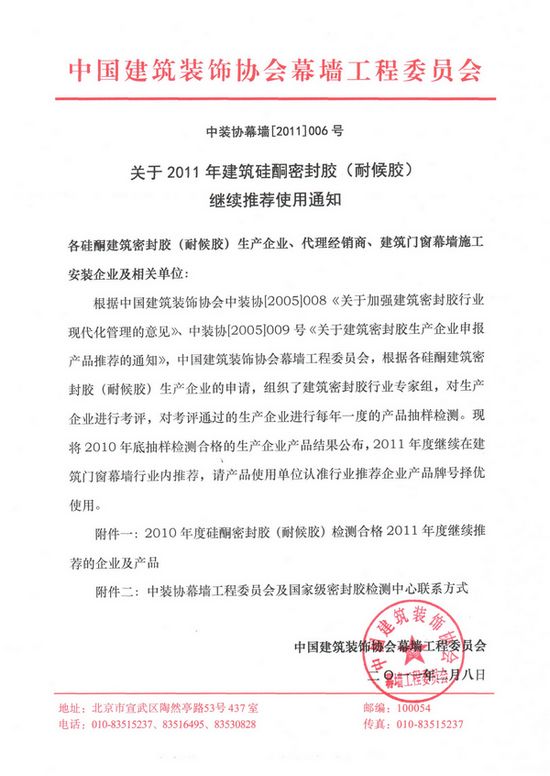 關(guān)于2011年建筑硅酮密封膠(耐候膠)繼續(xù)推薦使用通知