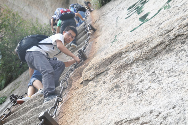 8月28號公司組織我們攀登西岳華山。因為早就知道華山以險著稱,所以就查看了很多關(guān)于華山的資料,圖片上登山道路蜿蜓曲折,處處是懸崖絕壁,峭峰陡立有好幾處接近九十度,只能抓著鐵索慢慢的往上爬??吹竭@些圖片我頓時忐忑不安,我甚至有些懷疑自己是否能順利登上華山頂。但又心情激動澎湃,好想挑戰(zhàn)自己,證明自己!