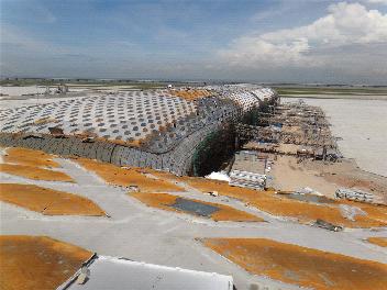 外幕墻施工由深圳三鑫、瑞華、方大共同承擔(dān)施工。幕墻總造價(jià)十幾個(gè)億,機(jī)身及兩翼分格為蜂巢狀分布,局部凹凸錯(cuò)落有致,拐彎連接處全部采用雙曲面玻璃、鋁板面材,近2/3的板材由不規(guī)則造型拼接,可想而知施工安裝及設(shè)計(jì)技術(shù)要求 (圖為深圳T3機(jī)場(chǎng))