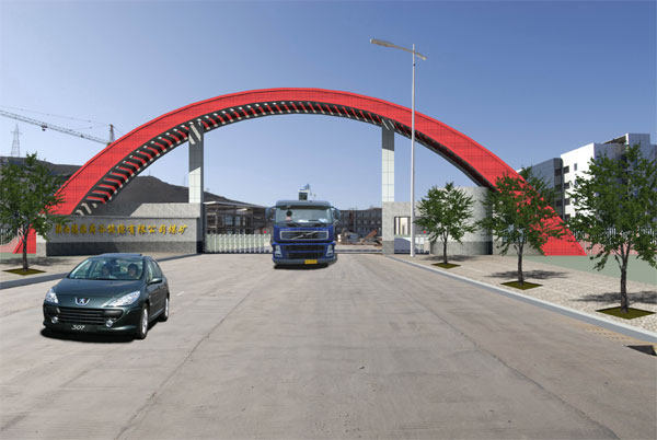 “陜西德源府谷能源有限公司三道溝煤礦門頭工程”是我公司于2009年在西北地區(qū)最大的煤炭基地(陜西省府谷縣廟溝門鎮(zhèn))竣工的一項從基地開始到安裝、裝飾的工程。門頭主體工程為雙曲線圓弧鋼結(jié)構(gòu)造型,外包紅色鋁塑板,中部兩個獨立柱支撐圓弧鋼結(jié)構(gòu),獨立柱外包花崗巖石材,總工期為60天。對此項工程,從設(shè)計圖紙開始到材料訂購、加工、安裝到最后工程竣工,我公司以雄厚的技術(shù)力量投入最好的設(shè)計隊伍,現(xiàn)場管理人員以及施工隊,最終在監(jiān)理公司的大力配合下,該工程按質(zhì)按期圓滿竣工,并得到甲方代表的一致好評,整個工程外觀大方得體,既熱情奔放又華而不炫,且有喜迎八方賓客之深意。其外觀如(圖1)。