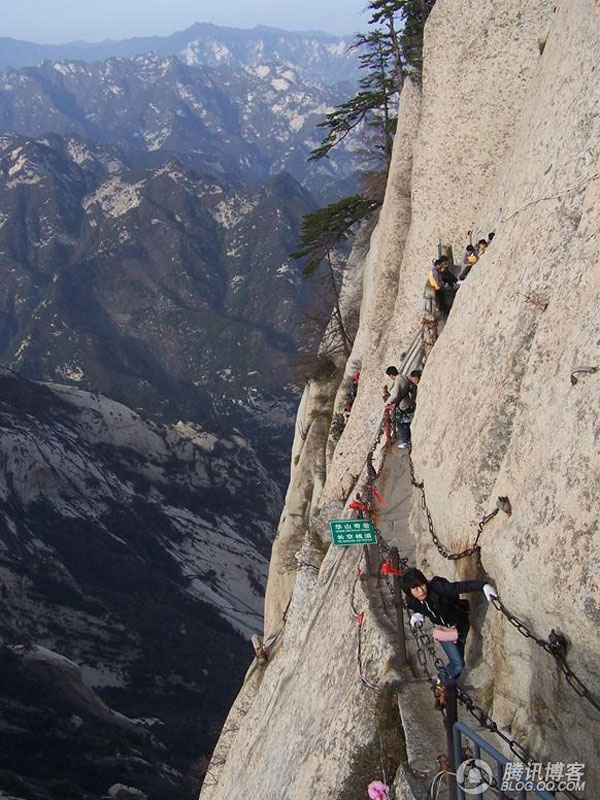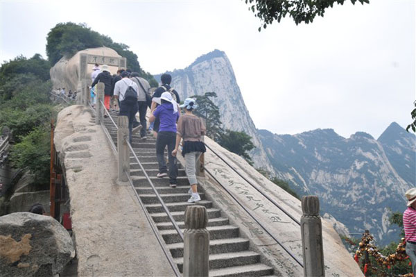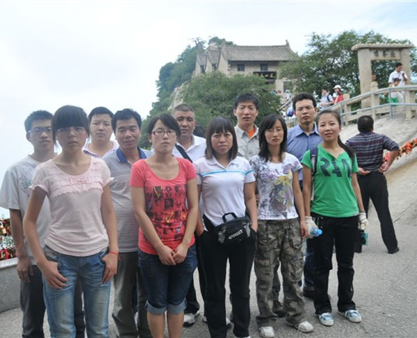 ,連猴子都發(fā)愁,說明崖壁是多么陡峭了。在這兩處,我們第一次領(lǐng)略了華山的“險(xiǎn)”,真所謂舉步艱難。這時(shí),走在前面的樊部長不斷的回頭告誡大家,手要抓穩(wěn),腳要踩實(shí)。吳總也是一次一次鼓勵(lì)大家,堅(jiān)持到底,就是勝利,同時(shí)又將兩個(gè)員工的行李背在了自己肩上。在他們這種精神的感召下,就連我們團(tuán)隊(duì)中年齡最大的王經(jīng)理也不甘示弱,奮勇直上。這時(shí)有個(gè)膽小的女游客發(fā)出驚叫,原來她在回頭看時(shí),對(duì)著陡峭的山谷一下恐慌起來,同伴們沒有放棄,一片鼓勵(lì)聲中,伸出堅(jiān)強(qiáng)有力的臂膀推著她,一起越過險(xiǎn)關(guān)。道路雖是艱險(xiǎn),可也讓我們感受到,一步一個(gè)驚喜,一步一次超越。