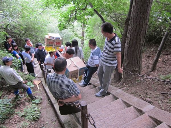 下山的時(shí)候,看著還在努力上山的人們,雖然有些筋疲力盡,心中卻是充滿自豪??删驮诖藭r(shí),心中的成就感卻被眼前的另一種景象所震驚,我們看見了兩個(gè)