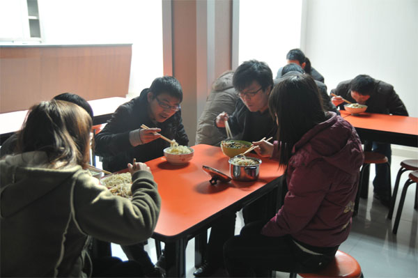 自公司搬家以來(lái),由于多種因素,各部門員工中午吃飯都要到離公司較遠(yuǎn)的市場(chǎng)就餐。隨著天氣漸冷,加之出去吃飯員工無(wú)法按時(shí)就餐,導(dǎo)致下午經(jīng)常不能按時(shí)上班,也增加了考勤管理的難度,影響了正常工作。為此,公司投入資金,按高標(biāo)準(zhǔn)、高質(zhì)量要求,購(gòu)配置了大功率天然氣灶具,有大型不銹鋼蒸烤爐、立式雙門冷柜、消毒碗柜、壓面機(jī)、保鮮柜、燒水器等設(shè)備,廚房和餐廳按標(biāo)準(zhǔn)化建設(shè)要求,制定了食堂管理員職責(zé)、廚師崗位職責(zé)、衛(wèi)生要求、為了陶冶大家健康的情操,使大家在一個(gè)優(yōu)美的環(huán)境里就餐,體現(xiàn)以人為本的項(xiàng)目管理理念,還在員工中廣泛征集意見(jiàn)和飲食口味,訂立《每周食譜》,墻上還裝上設(shè)計(jì)精美的宣傳標(biāo)語(yǔ)、美食圖。